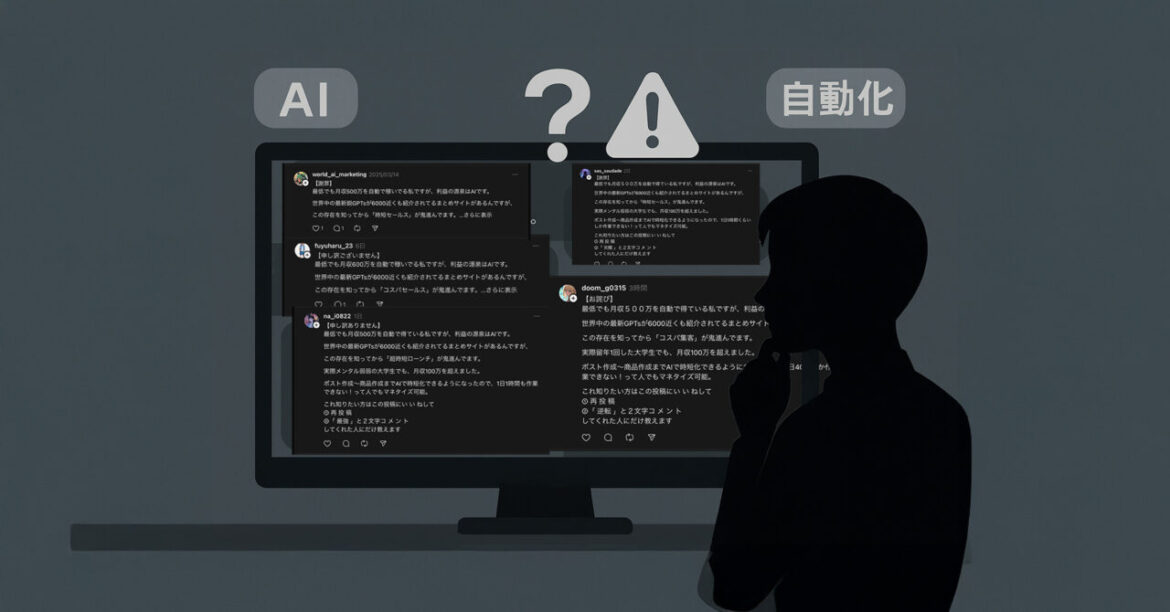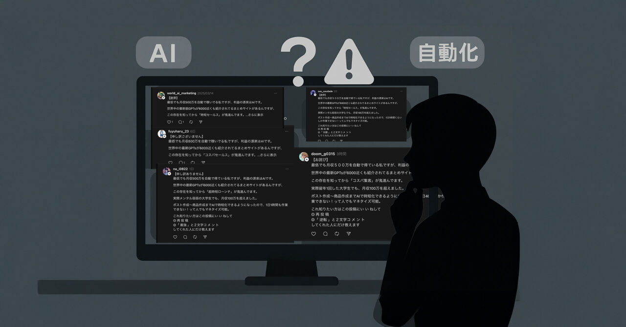 SNSに蔓延する「AIで月収500万」「1日1時間OK」投稿は、LINE誘導→有料商材・サロン販売の空虚なリレー構造で、実態はGPTsと自動投稿テンプレ拡散に過ぎず、損を負うのは常に後発側という指摘