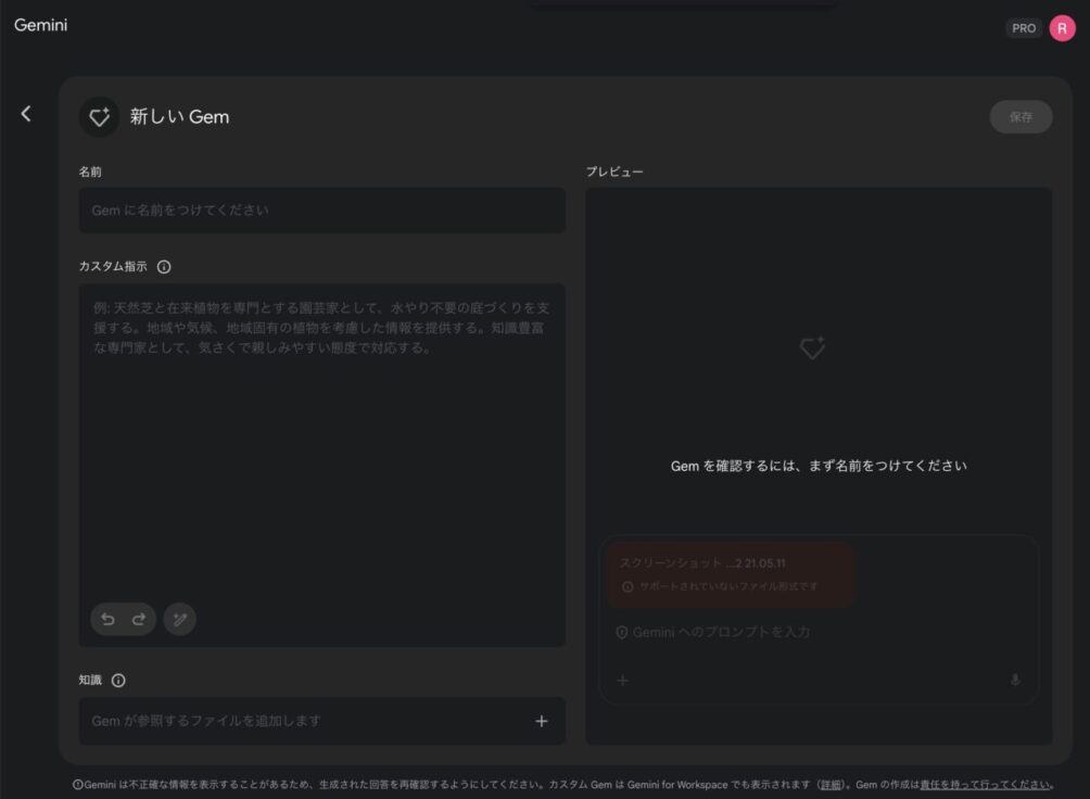 画面右側のプレビューエリアで、作ったGemがちゃんと期待通りに動くかテストするんだ。最初は「Gem を確認するには、まず名前をつけてください」なんて素っ気ないことを言われるかもしれないが、名前と指示を入れれば、だんだん言うことを聞いてくれるようになるはずだ。ここで色々試して、指示を微調整していくのがコツだな。 - 保存: