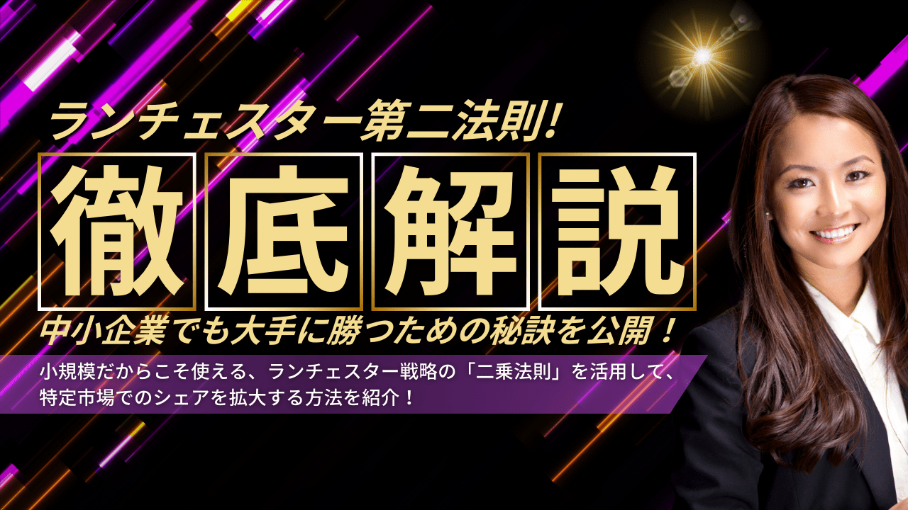 ランチェスター第二法則は、市場競争力は戦力の二乗に比例するという考え。小規模は局地戦へ資源を集中することで大手と互角以上の戦いが可能になり、ニッチ市場・地域密着・特定顧客層への集中、強みの徹底的な磨き、口コミ活用などの具体戦略を解説する。