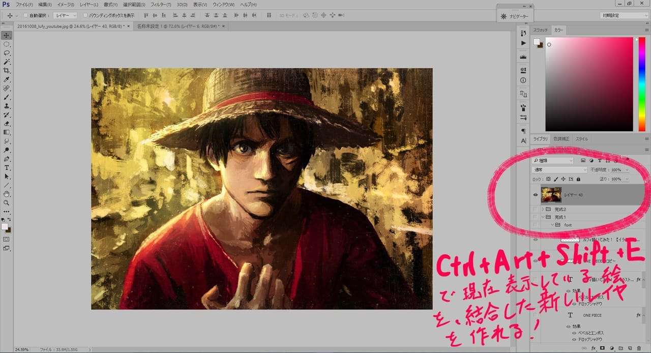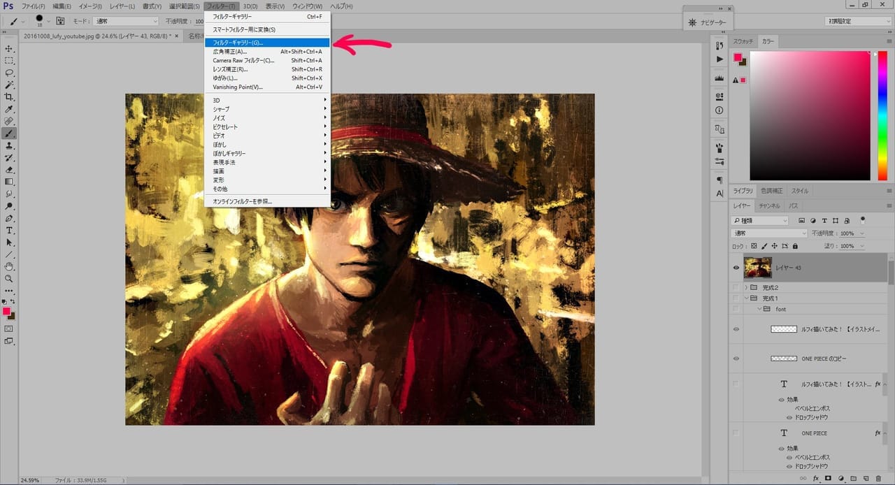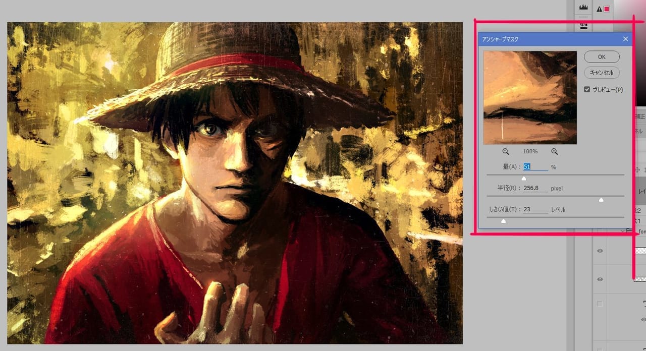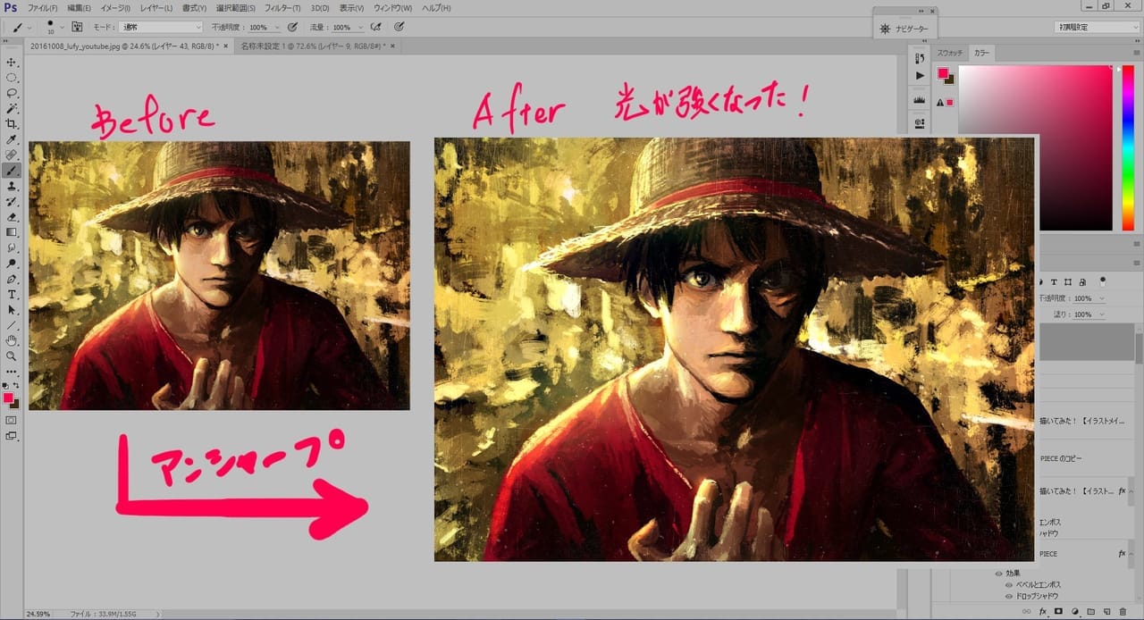 描いてみるのは皆さまも大好きな漫画、ワンピースの主人公「ルフィ」をリアルテイストな描き方(厚塗り)で描いていきます!
