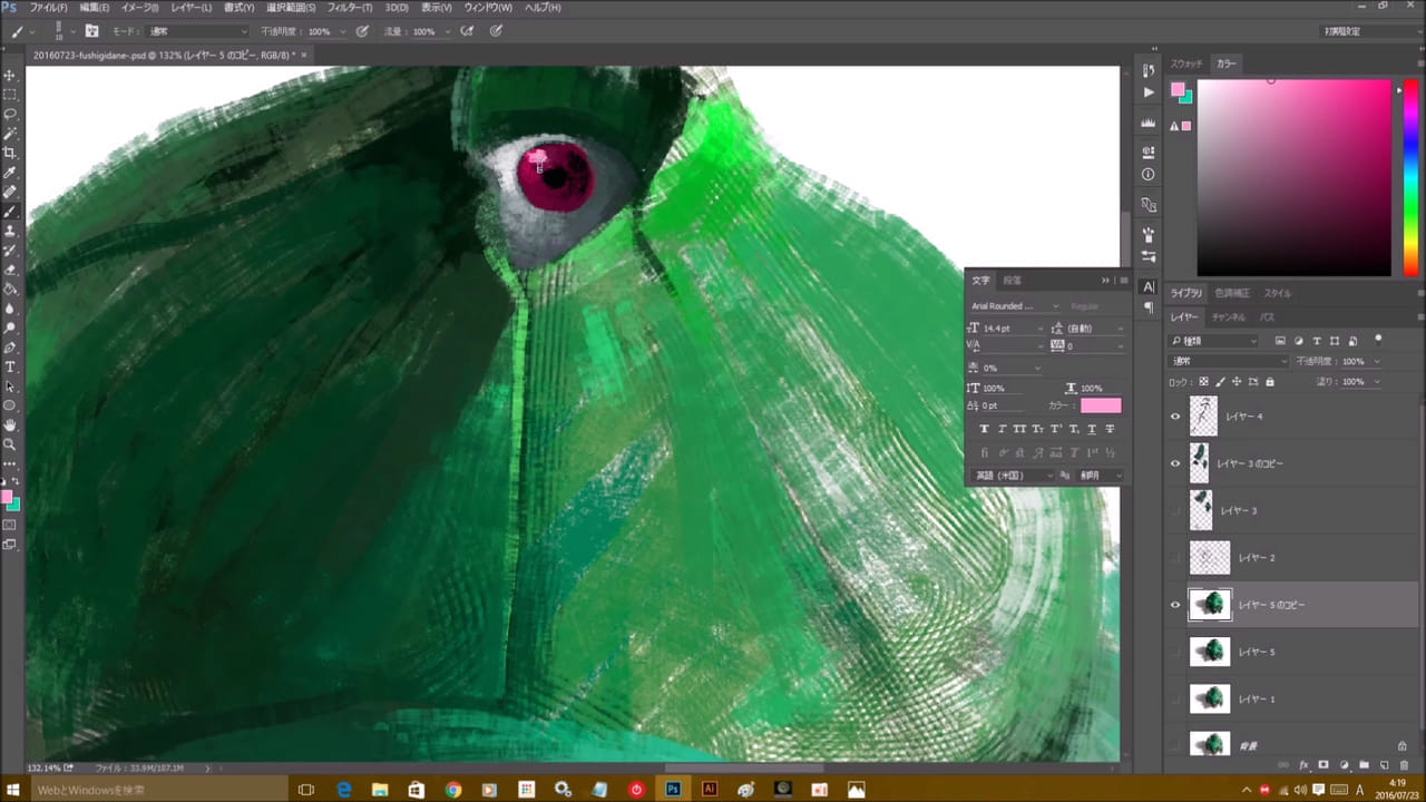 ですが仕事の時は修正や加工を相手ともしやすいように、ちゃんとレイヤーを分けてます。 それと色は、スポイト〔Alt〕で塗りたいとこの近くの色を取ってグラデーションを描いてます! 動画じゃ早すぎてわからないかもです!