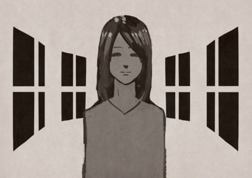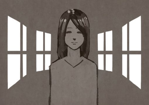 あかるい部屋に立つ女性。