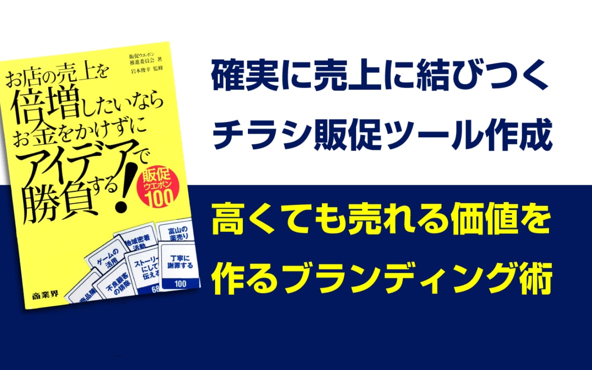 [amazonjs asin=”4785504749″ locale=”JP” title=”お店の売上を倍増したいならお金をかけずにアイデアで勝負する! ―販促ウエポン100″]